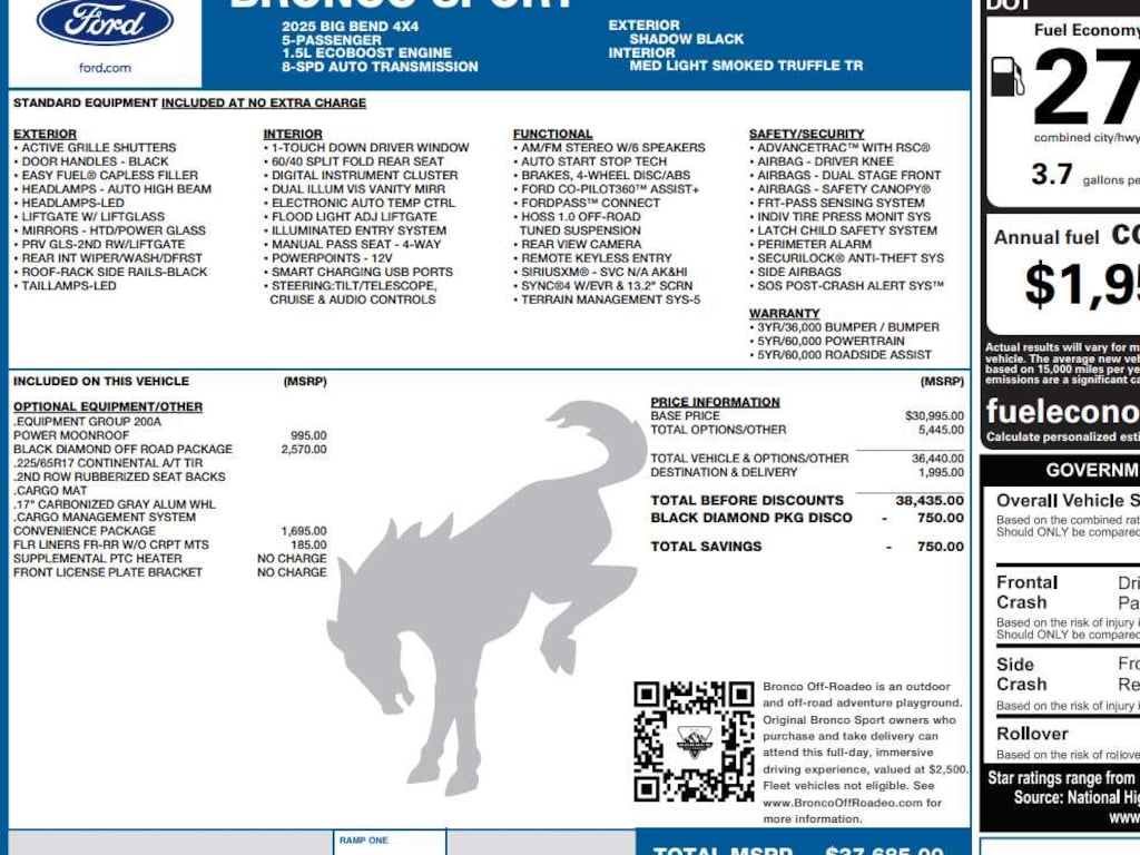 I got a 2025 Big Bend with the black diamond off road package. The steel modular front and rear in combination with bush guard gives this year model. A very aggressive off road look. With the ability to easily mount accessories and power them with the factory installed auxiliary switches. Hitch receiver seamlessly mounted into the rear steel bumper flanked by some very chunky recovery points. The upgraded aluminum rims wrapped with Continental all-terrains. It make this the most capable bronco sport yet. The interior of the 2025 has been updated with a new 13 inch touchscreen with Android Auto and apple car play. The lines of the dash flow elegantly from the new infotainment screen to the new all digital 12 inch gauge chaster. Toggling through the different modes on the gauge chaster is very intuitive, and all the displays are laid out very cleanly. Moving from gauge chaster the center storage cubby just below the infotainment screen there is a wireless charger and USB/ USB-c ports. The passenger side of that same cubby gets a handle and a matching one on the roof just in case the driver bucks a little too much. The passenger also gets a mesh storage area. That leads us to the fact this vehicle has tons of storage options all throughout. You have pockets on the sides of the front two seat big enough for the latest new phones. Very generous door storage on all four doors plus huge glove box and center console with 12 volt outlet. The back side of the center console has air vents and another 12 volt outlet plus a 110 outlet. Now getting to the cargo area it is massive for a crossover SUV. With off road package you get a cargo management system and a very nice rubber mat. Under that there is a full size tire plus scissor jack and funnel to use with the capless filler system. On the liftgate there isa pair of very bright led lights turned on with a switch in the cargo area. This feature packed vehicle has tons awesome gadgets and hidden a little homages I spend all day just talk that. At the end of the day it is car. So how does it drive. It is wonderful, the steering and pedal response is beautiful. Rides very smooth and little to no road noise going down the highway. The active cruise control and co-pilot 360 have been very handy. The car literally drives itself most of the time. There is not enough good things I could same about this car. I love it and you pick one too. You will see what I mean.… - 5.0
