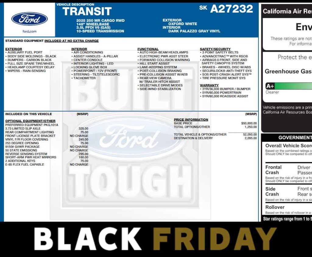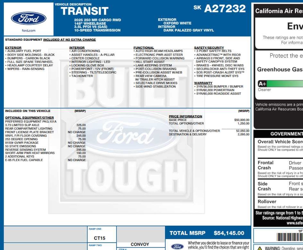 Back-Up Camera, Flex Fuel, iPod/MP3 Input, Bluetooth®, WiFi Hotspot Ford Transit Cargo Van with Oxford White exterior and Dark Palazzo Gray interior features a V6 Cylinder Engine with 275 HP at 6250 RPM*.