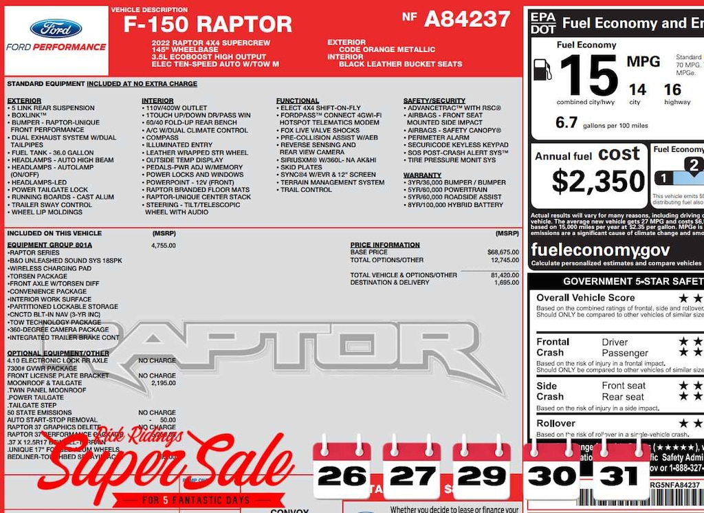 Raptor 37 Graphics, Sport Tuned Shock Absorbers, Wheels: Unique 17" Forged Aluminum Bead-Lock Capable, Tires: 37x12.5R17 BSW All-Terrain, Wireless Charging Pad, Rain-Sensing Wipers, Power Tilt/Telescoping Steering Column w/Memory, Torsen Package, Front-Axle w/Torsen Differential, Rigid LED Fog Lamp, Convenience Package, Interior Work Surface, Connected Built-In Navigation, Navigation services require SYNC4 and FordPass Connect (optional on select vehicles), complimentary connect service and the FordPass app (see FordPass Terms for details), Eligible vehicles receive a complimentary 90-day trial of navigation services that begins on the new vehicle warranty start date, Customers must unlock the navigation service trial by activating the eligible vehicle w/a FordPass member account, If not subscribed by the end of the complimentary period, the navigation service will terminate, Connected service and features depend on, Power Tailgate, Twin Panel Moonroof, TOUGH BED SPRAY-IN BEDLINER, terrain management modes: normal, sport, tow-haul, slippery, rock crawl, off-road and baja mode (STD).