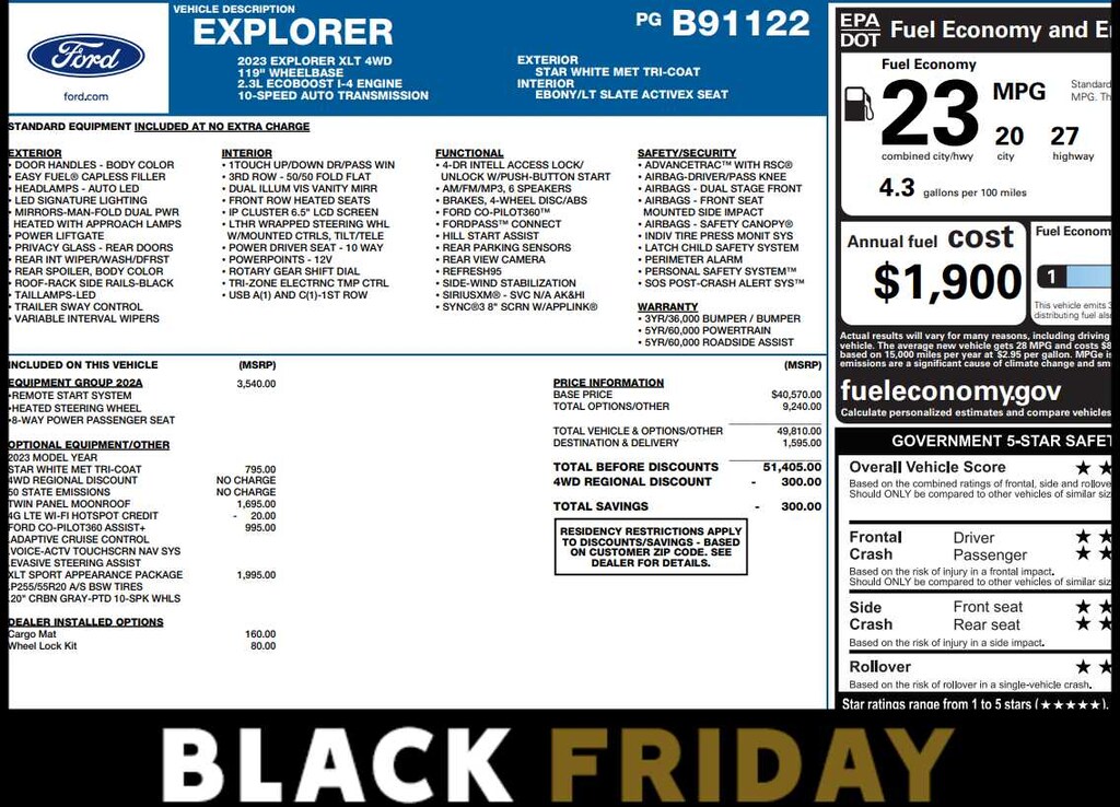 EQUIPMENT GROUP 202A SecuriCode Keyless Entry Keypad, Acoustic-Laminated Front Side Windows, Remote Start System, Heated Steering Wheel, LED Fog Lamps, silver-painted front skid plate elements, XLT SPORT APPEARANCE PACKAGE carbonized gray-painted grille bars and mesh insert, liftgate applique, lower body side cladding insert, skid plate elements, carbonized gray EXPLORER badge on hood, stretch diamond instrument panel appliques, ebony/light slate seats w/medium slate contrast stitching in all rows, unique light slate door-trim panel insert w/contrast stitching and sideview mirrors w/gloss black caps, Wheels: 20 10-Spoke Carbonized Gray-Painted, Tires: P255/55R20 AS BSW, Dual Chrome Exhaust Tips, TWIN PANEL MOONROOF, FORD CO-PILOT360 ASSIST+ Speed Sign Recognition, Voice-Activated Touchscreen Navigation System, pinch-to-zoom capability, SiriusXM Traffic and Travel Link, Note: SiriusXM Traffic and Travel Link includes a, SiriusXM Traffic and Travel Link service is not available in Alaska or Hawaii, After your trial period ends, Sirius XM audio and data services each require a subscription sold separately, or as a package, by SiriusXM Radio Inc, See SiriusXM customer agreement for complete terms at www.siriusxm.com, All fees and programming subject to change, Trial subscriptions not available in Alaska and Hawaii, Evasive Steering Assist, Intelligent Adaptive Cruise Control, stop-and-go and lane centering, TRANSMISSION: 10-SPEED AUTOMATIC (STD).