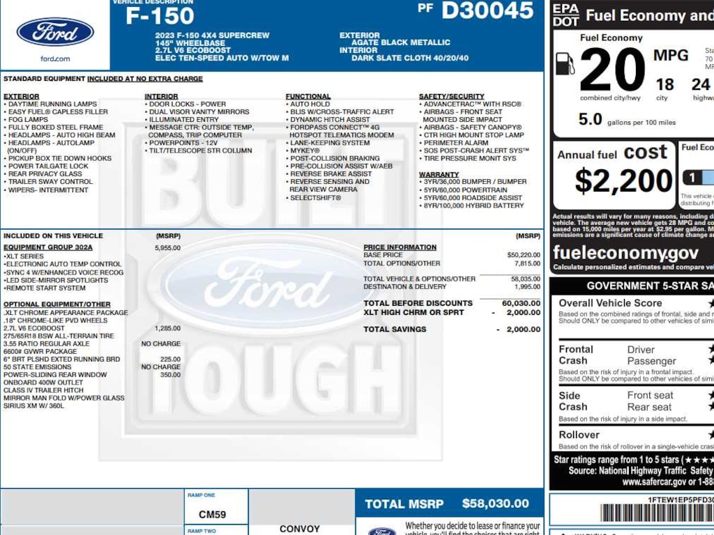 Class IV Trailer Hitch Receiver, towing capability up to TBD lbs, on 3.3L V6 PFDI engine (99B) and 2.7L EcoBoost engine (99P) or up to TBD lbs, on 3.5L EcoBoost engine (998) and 5.0L V8 engine (995), 7/4-pin connector, class IV trailer hitch receiver, smart trailer tow connector ( BLIS w/trailer tow coverage where BLIS is available), XLT Chrome Appearance Package, lower grille trim, Chrome Single-Tip Exhaust, Tires: 275/65R18 BSW Automatic Transmission, Chrome Door & Tailgate Handles w/Body-Color Bezel, bezel on side doors and black on tailgate, Wheels: 18 Chrome-Like PVD, 2-Bar Style Grille w/Chrome 2 Minor Bars, silver painted surround and black background mesh, Bright Polished Step Bars, Zone Lighting, Intelligent Access w/Push Button Start, approach detection, SecuriCode Drivers Side Keyless-Entry, 3.55 Axle Ratio, GVWR: 6,600 lbs Payload Package, selectable drive modes: normal, ECO, sport, tow/haul, slippery, deep snow/sand and mud/rut (STD).
