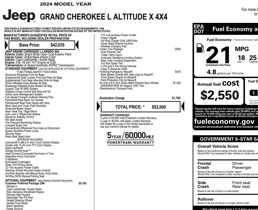 QUICK ORDER PACKAGE 23M ALTITUDE X Engine: 3.6L V6 24V VVT UPG I w/ESS, Transmission: 8-Speed Automatic (8HP50), Altitude X, Selectable Tire Fill Alert, Remote Start System, Rain Sensitive Windshield Wipers, Wireless Charging Pad, Heated Front Seats, Black Headliner, Power Sunroof, Delete Laredo Badge, 3rd Row Charge-Only USB Ports, 115V Auxiliary Power Outlet, Gloss Black Exterior Accents, Heated Steering Wheel, Power Liftgate, WHEELS: 20 X 8.5 GLOSS BLACK PAINTED ALUMINUM Tires: 265/50R20 BSW A/S LRR, TRAILER TOW PACKAGE Rear Load Leveling Suspension, Full Size Spare Tire, 180 Amp Alternator, 7 & 4 Pin Wiring Harness, Dual Exhaust Tips, Heavy Duty Engine Cooling, 18 Full-Size Steel Spare Wheel, Automatic Headlamp Leveling System, Trailer Hitch Zoom, Class IV Receiver Hitch, TRANSMISSION: 8-SPEED AUTOMATIC (8HP50) (STD), ENGINE: 3.6L V6 24V VVT UPG I W/ESS (STD).