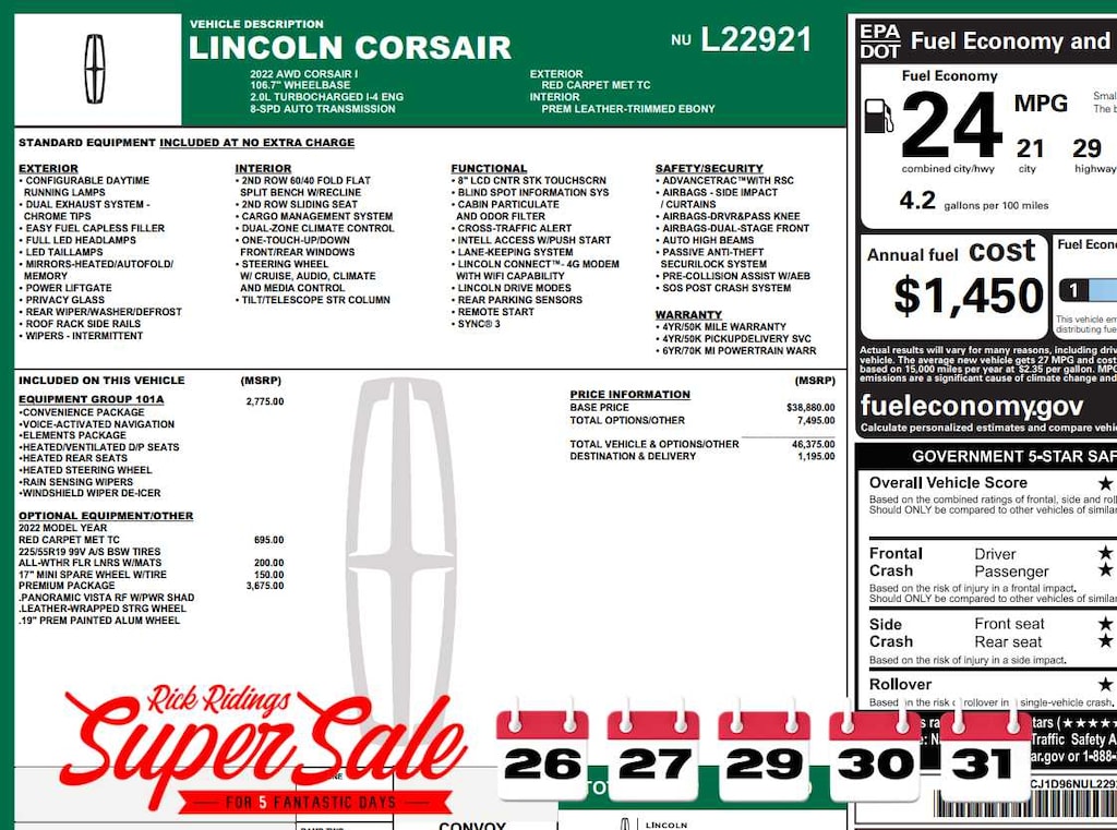 Power Liftgate, Back-Up Camera, Satellite Radio, iPod/MP3 Input, Onboard Communications System Lincoln Standard with Red Carpet Metallic Tinted Clearcoat exterior and Ebony interior features a 4 Cylinder Engine with 250 HP at 5500 RPM*.