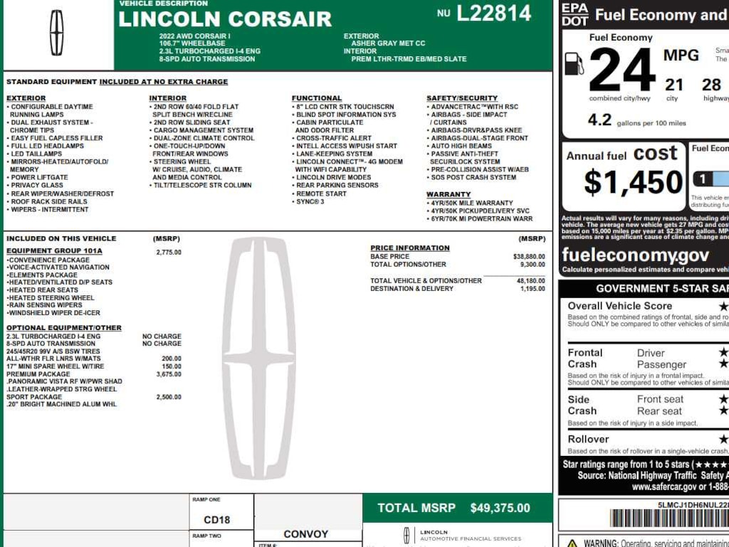 Ventura Leather-Wrapped Steering Wheel, Wheels: 19 Premium Painted Aluminum, Panoramic Vista Roof w/Power Shade, Tires: 225/55R19 99V All-Season BSW, Ambient Lighting, Elements Package, Windshield Wiper De-Icer, Heated Rear Seat, Heated/Ventilated Driver & Front Passenger Seats, Heated Steering Wheel, Rain Sensing Wipers, Convenience Package, Voice-Activated Touchscreen Navigation System, pinch-to-zoom capability, Universal Garage Door Opener, 60/40 EasyFold Rear Seat w/Power Seatback Release, Body-Color Front Bumper w/Painted Lower Fascia, Illuminated Front Scuff Plates, Body-Color Plastic Rear Bumper, Engine: Turbocharged 2.3L I-4, Tires: 225/55R19 99V All-Season BSW, Unique Lincoln Design Body-Color Mesh Upper Grille, ALL-WEATHER FLOOR LINERS W/FR&RR CARPET FLOOR MATS.