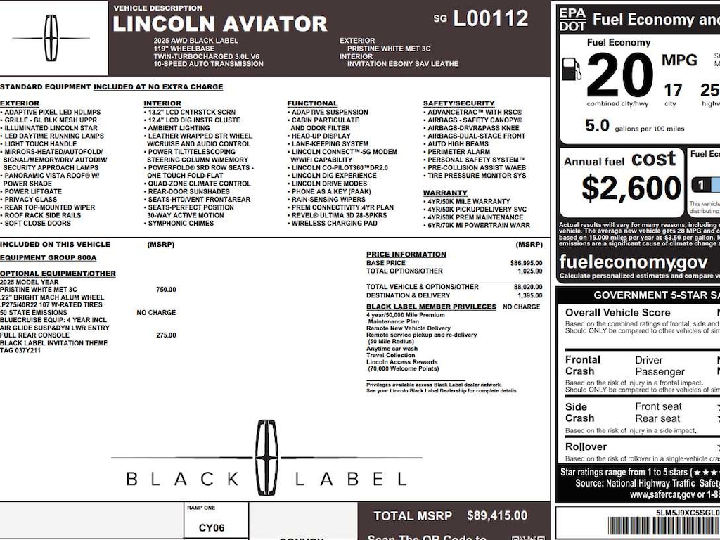Leather Seats, Third Row Seat, Navigation, Sunroof, Panoramic Roof Lincoln Black Label with Pristine White Metallic Tri-Coat exterior and Ebony interior features a V6 Cylinder Engine with 400 HP at 5500 RPM*.