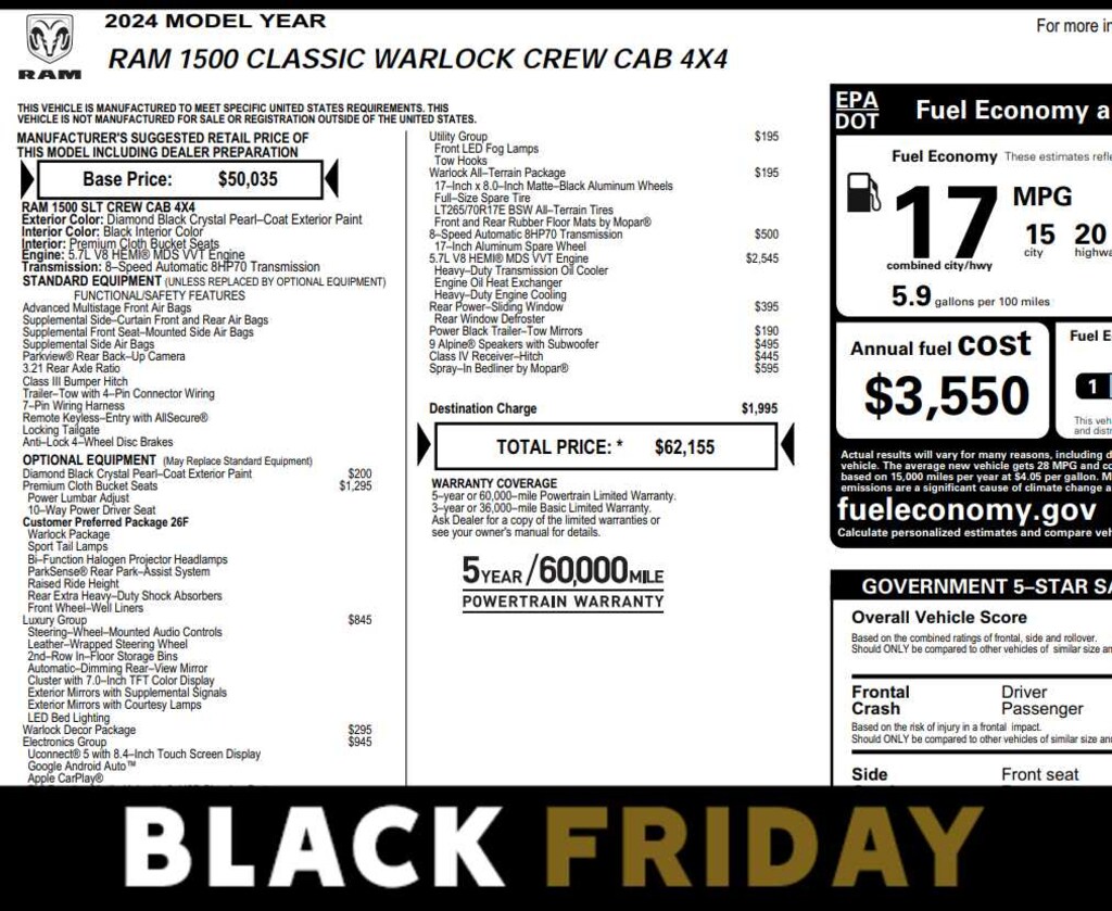 ENGINE: 5.7L V8 HEMI MDS VVT Electronically Controlled Throttle, Heavy Duty Engine Cooling, Dual Exhaust w/Black Tips, 17 Aluminum Spare Wheel, Next Generation Engine Controller, Engine Oil Heat Exchanger, HEMI Badge, BLACK, PREMIUM CLOTH BUCKET SEATS Power Lumbar Adjust, 115V Auxiliary Power Outlet, Bucket Seats, Rear 60/40 Split Folding Seat, Folding Flat Load Floor Storage, Power 10-Way Driver Seat, Full Length Upgraded Floor Console, ELECTRONICS GROUP Google Android Auto®, USB Host Flip, Media Hub (2 USB, AUX), Integrated Center Stack Radio, Rear View Auto Dim Mirror, Air Conditioning ATC w/Dual Zone Control, 4G LTE Wi-Fi Hot Spot, SiriusXM Guardian - Included Trial (B), (Registration Required), Global Telematics Box Module (TBM), For Details Visit DriveUconnect.com, Cluster 7.0 TFT Color Display, Humidity Sensor, Radio: Uconnect 5 W w/8.4 Display, 8.4 Touchscreen Display, Apple CarPlay®, LUXURY GROUP Rear View Auto Dim Mirror, Leather Wrapped Steering Wheel, Exterior Mirrors w/Supplemental Signals, Rear Dome w/On/Off Switch Lamp, LED Bed Lighting, Steering Wheel Mounted Audio Controls, Exterior Mirrors Courtesy Lamps, Auto Dim Exterior Mirrors, Cluster 7.0 TFT Color Display, Universal Garage Door Opener, Power-Folding Mirrors, 2nd Row In Floor Storage Bins, Power Heated Fold-Away Mirrors, Sun Visors w/Illuminated Vanity Mirrors, Overhead Console w/Garage Door Opener, HEATED SEATS & WHEEL GROUP Heated Steering Wheel, Humidity Sensor, Heated Front Seats, MOPAR SPRAY IN BEDLINER, TRANSMISSION: 8-SPEED AUTOMATIC (8HP70) (DFK), 9 ALPINE SPEAKERS W/SUBWOOFER, CLASS IV RECEIVER HITCH, REMOTE START & SECURITY ALARM GROUP Remote Start System, Security Alarm, REAR POWER SLIDING WINDOW Rear Window Defroster, UTILITY GROUP Front LED Fog Lamps, Tow Hooks, WARLOCK ALL TERRAIN PACKAGE Tires: LT265/70R17E BSW Automatic Transmission, Full Size Spare Tire, Yokohama Brand Tires, MOPAR Front & Rear Rubber Floor Mats, Wheels: 17 x 8 Matte Black Aluminum.